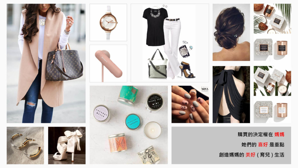 目前業者的市場是中國大陸 , 因此我們 Research 了現在中國的年輕媽媽 , 25 ~ 40 歲 , 即 80 與 90後 , 她們從小接受歐美文化的薰陶 , 對於生活態度 , 時尚穿搭都有自己的看法與堅持 , 有對高品質生活的崇尚 . 她們不再如同長輩 , 婚後為家事操勞 , 蓬頭垢面 . < 育兒 > 當然也是她們美好生活的一部分 , 我們是否有機會提供其對美好生活的想像 , 補足她們與市場的這個缺口呢 ?