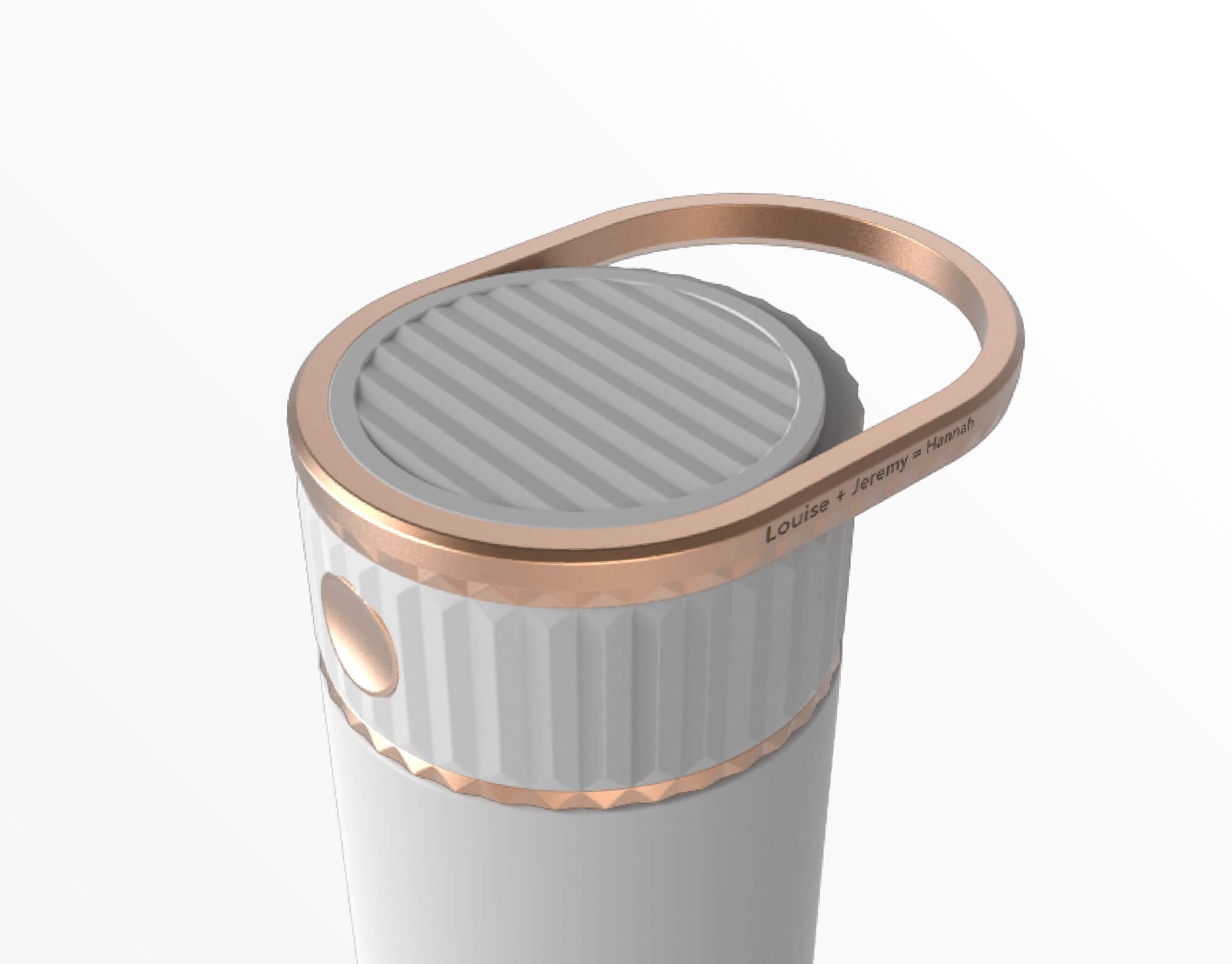1. 圓形上蓋搭配長條圓邊 , 既是滑蓋的軌道 , 也是提把 . 上面可以雷射雕刻消費者的名字 , 圖案 , 或其他符號 .