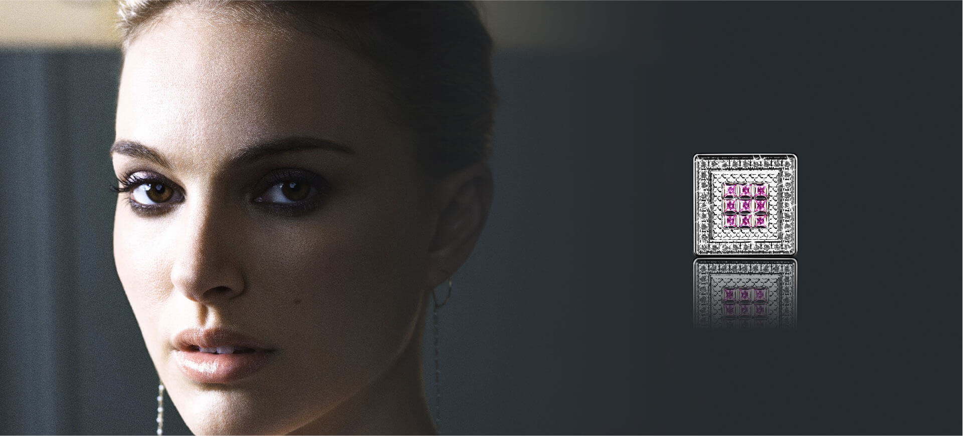 正面 9 顆粉鑽矩陣 , 外圍球狀凸點 , 最外圍 4 邊透明水鑽襯托 . 美就這樣被層層包圍著 , 哪裡也去不了 , 停在了這一 < 奢華時刻 > .